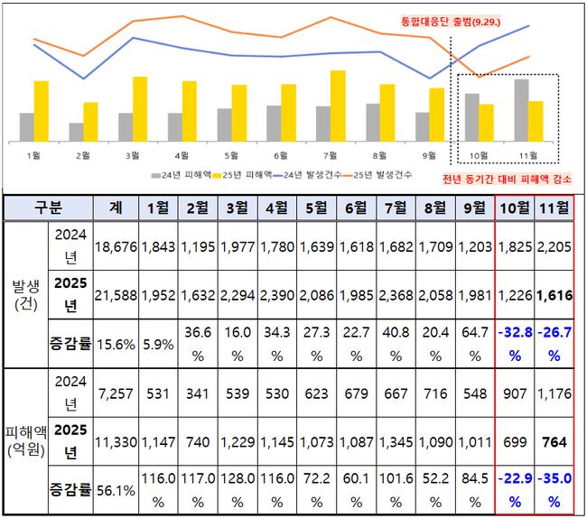 • 올해 11월까지 누적 피해액 1조1330억… 10~11월은 감소세