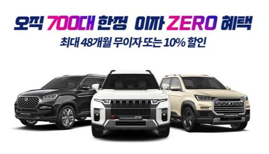 전기차 ▲무쏘 EV와 ▲토레스 EVX도 선수금(0∼50%)에 따라 0%(무이자)∼5.3% 금리의 12∼72개월 할부를 적용할 수 있다.