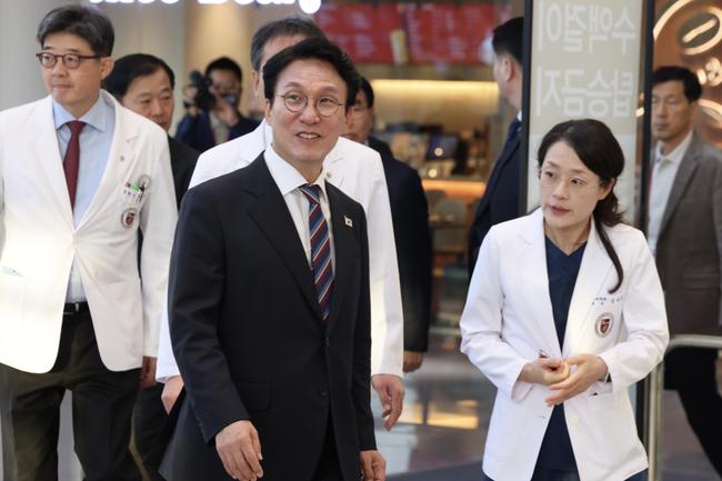 김민석 국무총리가 12일 권역응급의료센터 현장점검 차 성북구 고려대학교 안암병원을 방문, 시설을 둘러보고 있다.