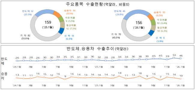 품목별로 보면 반도체 수출이 전년 대비 45.6% 증가하며 전체 수출을 견인했다. 석유제품(13.2%), 무선통신기기(33.7%)도 증가세를 보였다. 반면 승용차 수출은 24.7% 감소했고, 선박도 12.7% 줄어 대조를 이뤘다. 반도체 수출 비중은 29.8%로 1년 전보다 9.8%포인트 확대됐다.